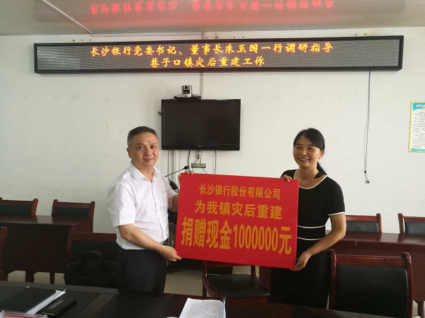 朱玉国董事长表示,作为本次市驻镇灾后重建指导组副组长单位,长沙银行将不负市委和全镇人民期望,心系灾区、积极担当,全力以赴参与巷子口镇的灾后重建工作。在座谈会现场,朱玉国董事长代表长沙银行捐赠现金100万元、物资30万元,重磅支持巷子口镇的重建工作。灾后重建,我们始终与巷子口人民在一起!